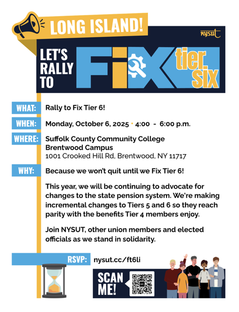 "First up is the Fix Tier 6 Rally at the SCCC Brentwood Campus on Monday, October 6th, from 4–6 p.m. Please check out the flyer below and RSVP here. This is a big deal. We need to remind politicians that we won’t quit until we Fix Tier 6! Please let me know if you plan on attending, and join us if you can." - Alex Marange
